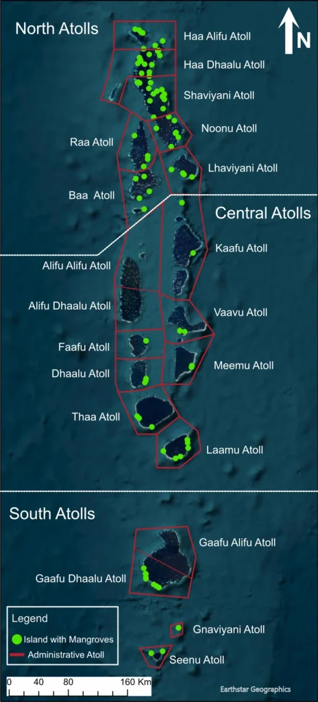 The map shows mangroves are found in small patches across at least 108 islands in the Maldives. Take a look to see where your nearest mangrove forest is.