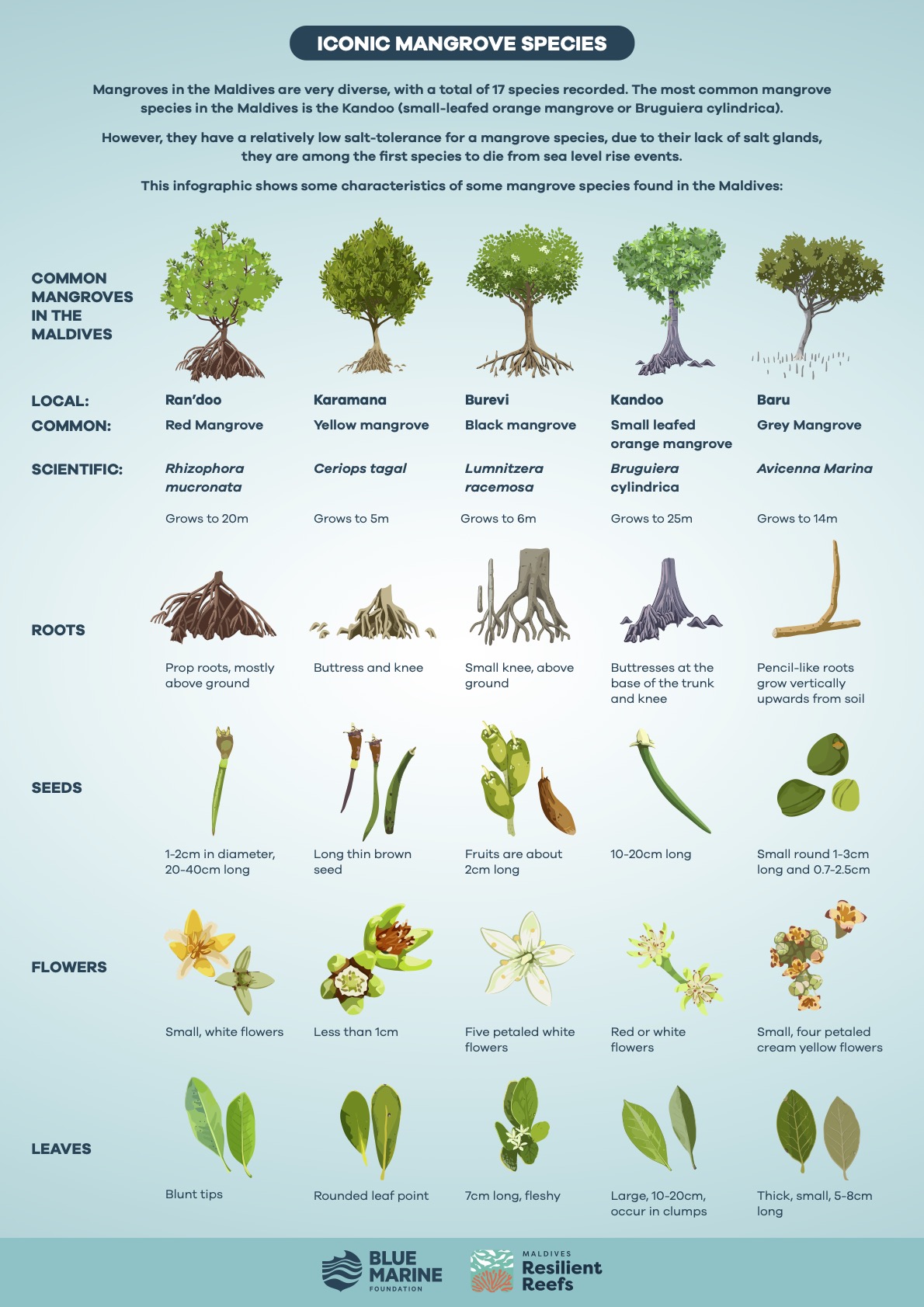 The Following table shows the common, local and scientific names of all mangrove species in the Maldives.